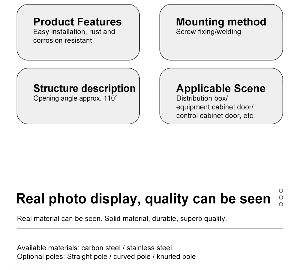 Yitai Lock ມີ Distribution Board Swivel Hinge ໃນຫຼັກຊັບສໍາລັບໂຄງການຕູ້ອຸດສາຫະກໍາ. ດ້ວຍມຸມເປີດສູງເຖິງ 110°, ກະດານກະຈາຍ CL248 Swivel Hinge ໃຫ້ພື້ນທີ່ກວ້າງຂວາງສໍາລັບການສາຍ, ການກວດກາ, ແລະການບໍາລຸງຮັກສາ. ມັນສາມາດໄດ້ຮັບການສ້ອມແຊມໂດຍ screws ຫຼືການເຊື່ອມໂລຫະໂດຍອີງໃສ່ໂຄງສ້າງຕູ້. ດ້ວຍ rod ຊື່ທາງເລືອກ, rod ງໍ, ຫຼື knurled rod, ກະດານກະຈາຍ Swivel Hinge ປັບຕົວເຂົ້າກັບໂຄງຮ່າງປະຕູທີ່ແຕກຕ່າງກັນແລະວິທີການປະກອບ.